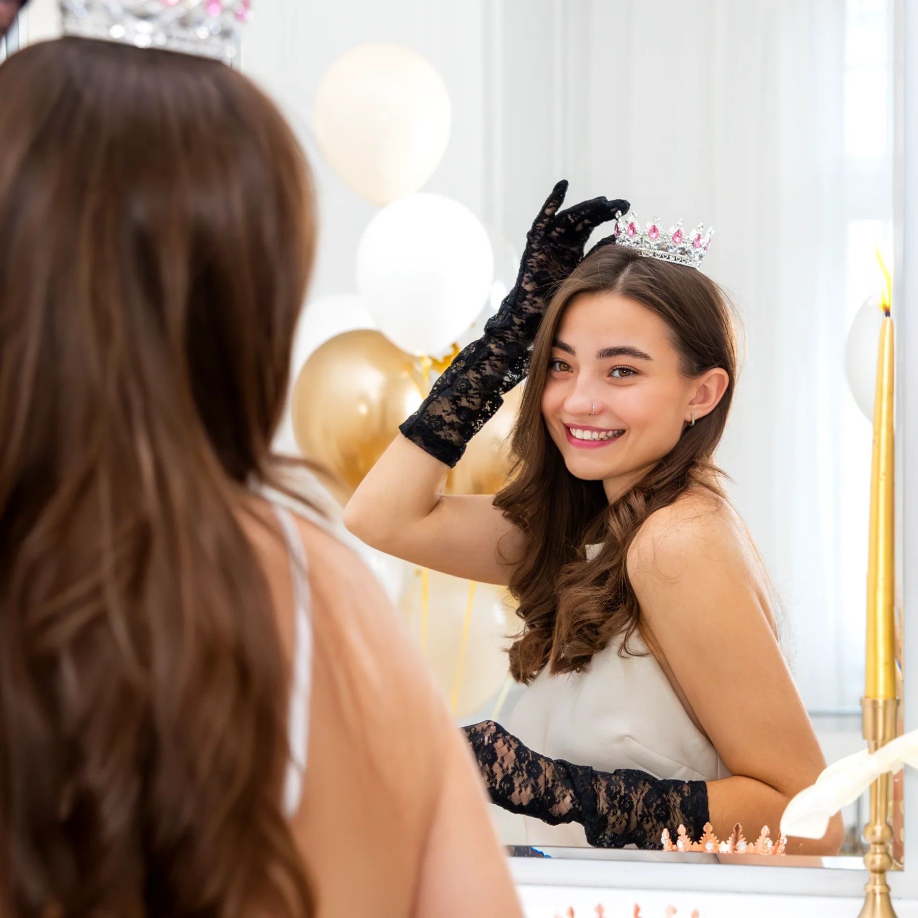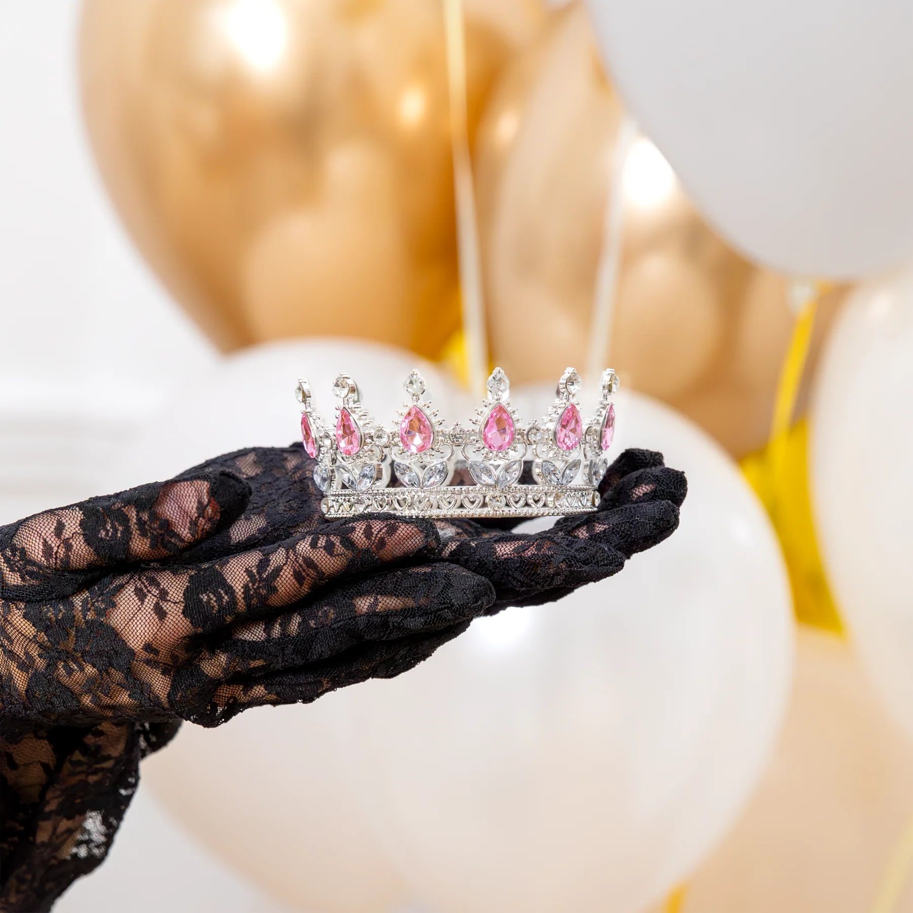 Korona w kolorze srebrnym z różowymi i srebrnymi kryształkami doda blasku każdemu przyjęciu, podkreślając jego wyjątkowy charakter.