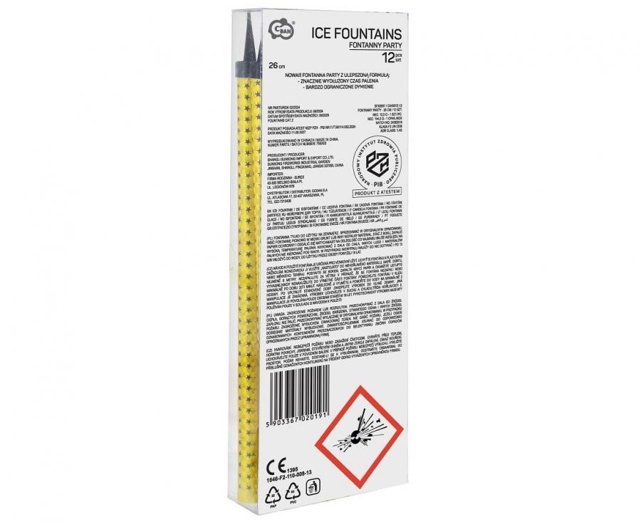 Fontanny posiadają plastikową końcówkę zabezpieczającą. W celu odpalenia fontannę należy umieścić pionowo, następnie zapalić papier uszczelniający i niezwłocznie oddalić się na odległość ok.1 m. Z fontanny sypią się złoto-srebrne iskierki. Do artykułu dołączona jest instrukcja obsługi.