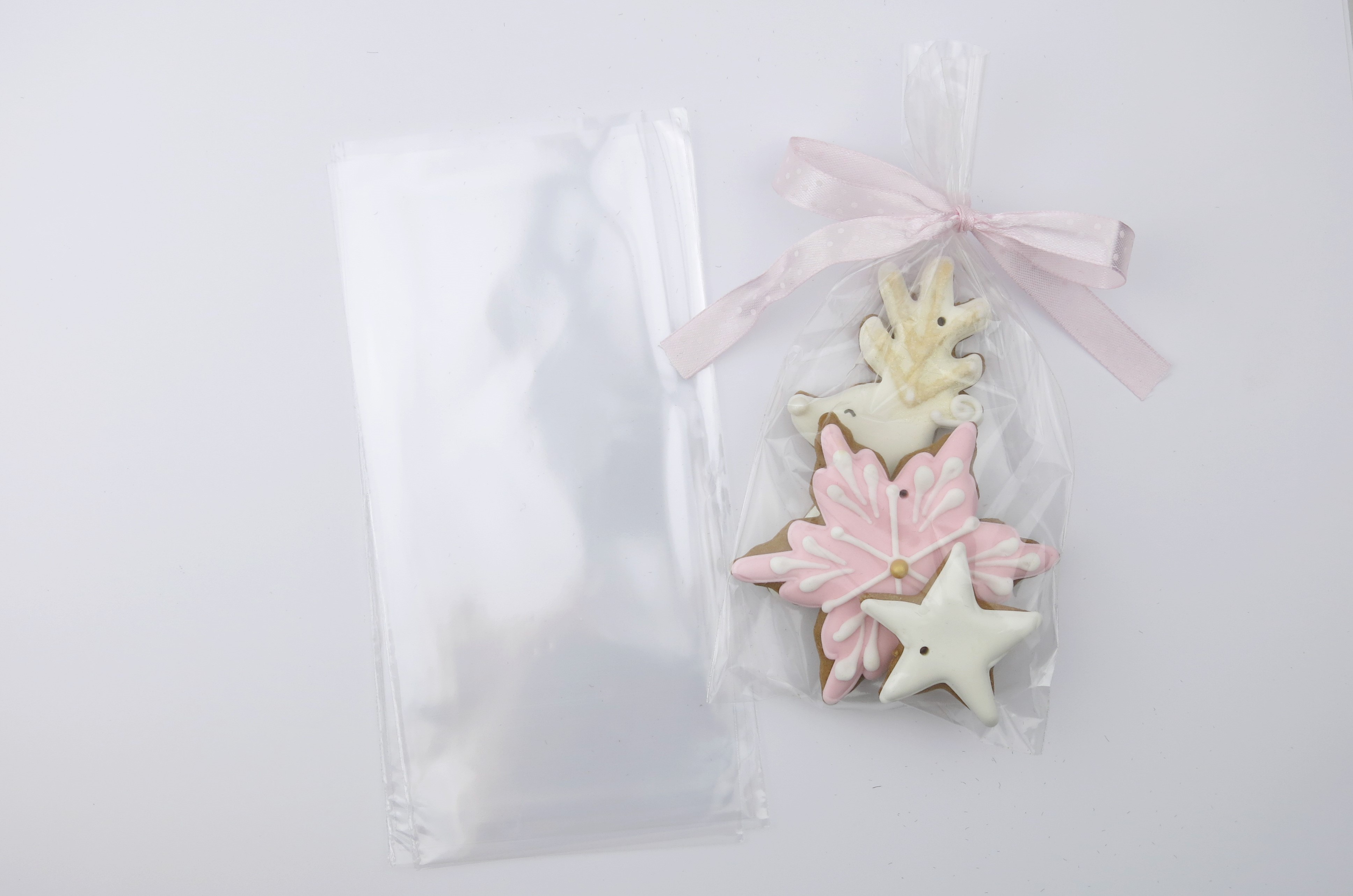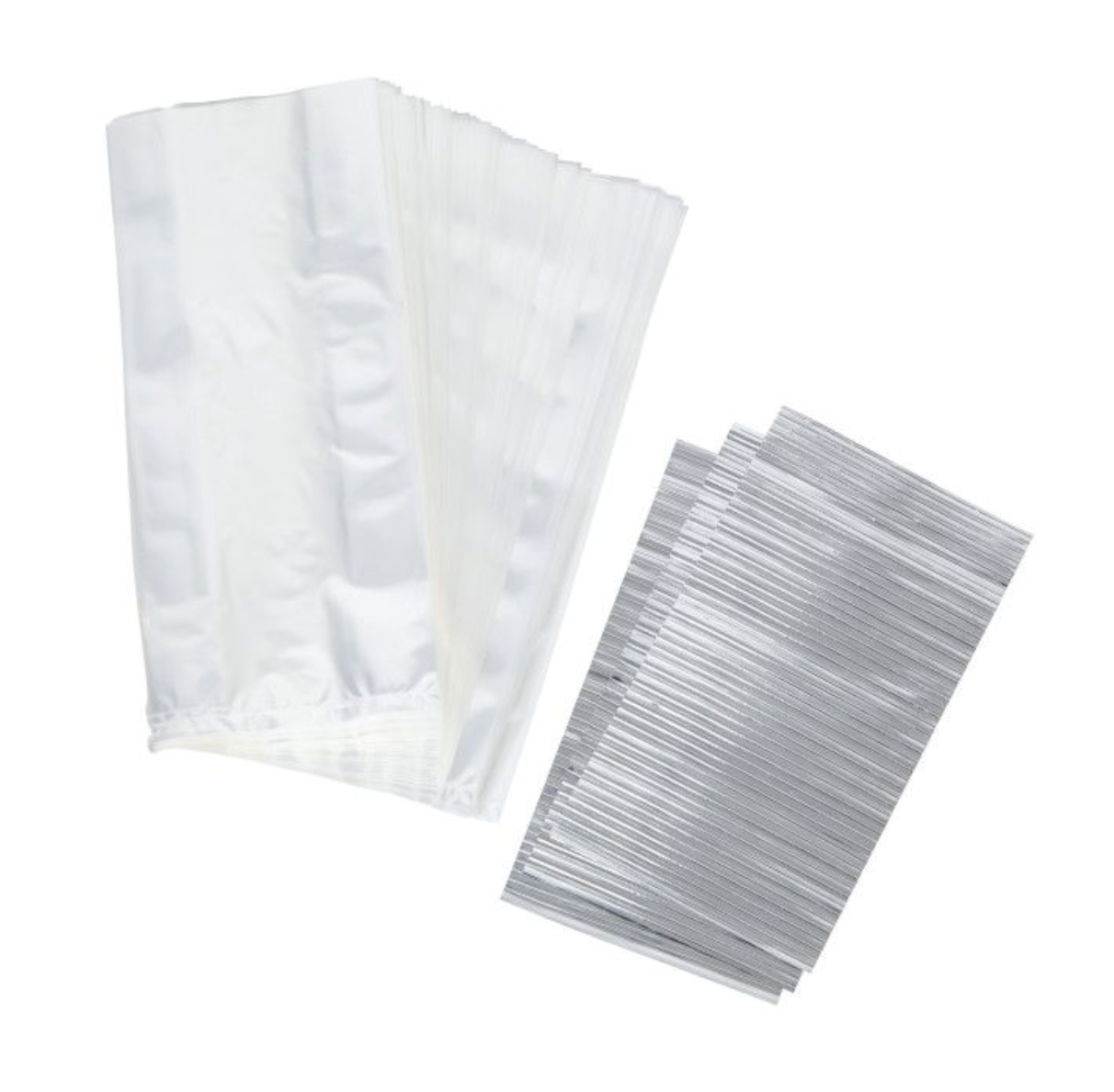 Zestaw zawiera 150 szt. przezroczystych torebek foliowych i 150 szt. powlekanych, srebrnych drucików do zamykania torebek.